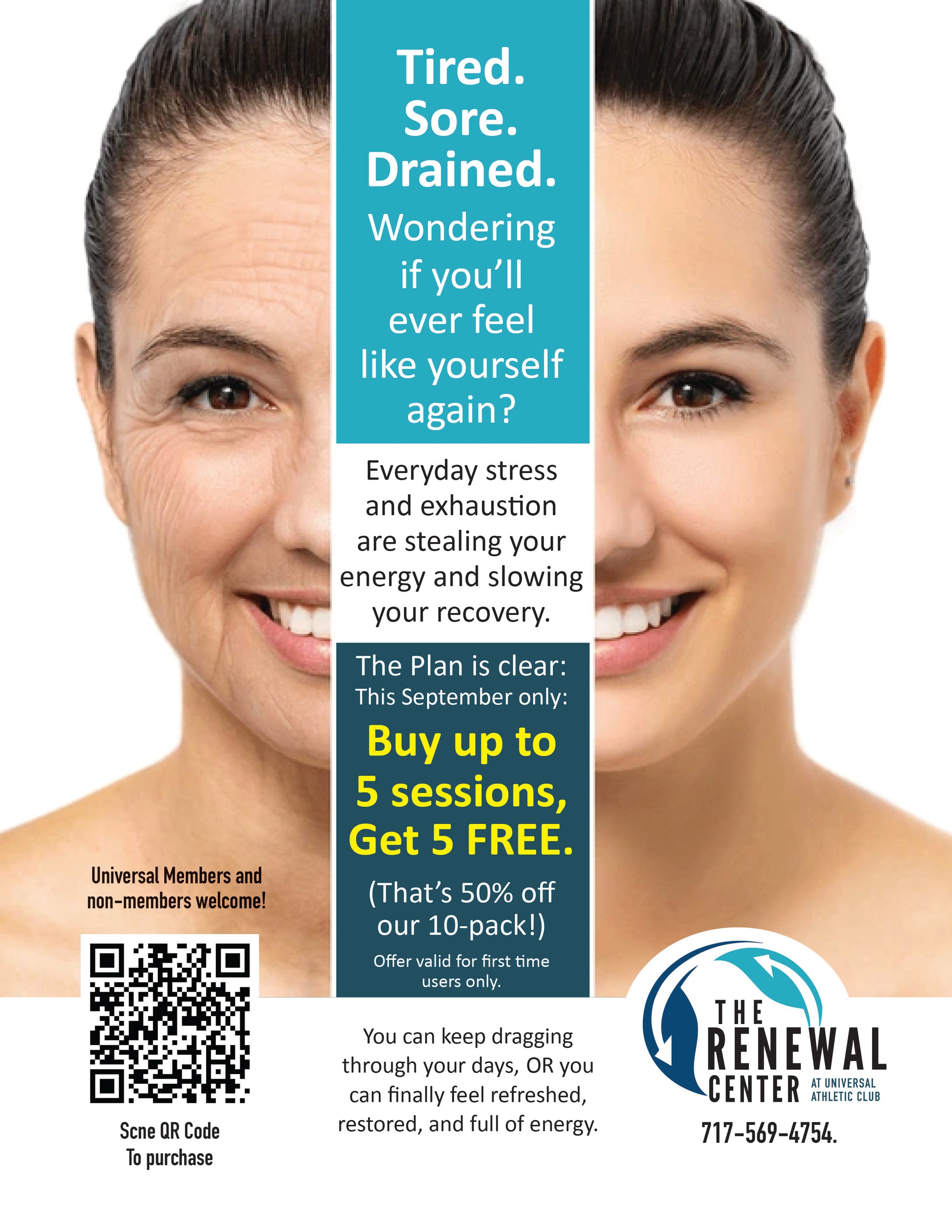 This September only: Buy 5 sessions, Get 5 FREE.* (That’s 50% off our 10-pack!) You can keep dragging through your days, OR you can finally feel refreshed, restored, and full of energy.